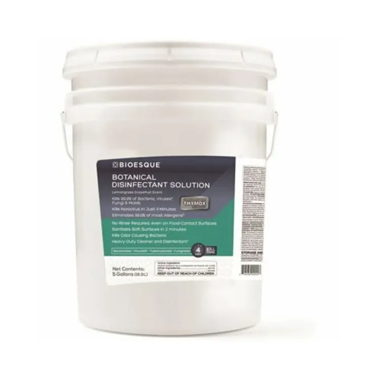 Cleans, sanitizes, disinfects and deodorizes in a single step, BIOESQUEs Botanical Disinfectant Solution is the natural solution for a wide range of cleaning challenges. With a formula that is free of bleach and other harsh chemicals, BIOESQUEs Botanical Disinfectant Solution is a great choice for hazard-conscious or environmentally sensitive settings. Powered by Thymox technology, it utilizes Thymol, a cutting-edge antimicrobial agent present as a component of Thyme Oil, to quickly power through grime and destroys the germs that it encounters. Kills Viruses in 1-minute, kills Bacteria in 2-minutes, kills Fungi and Molds in 3-minutes, and kills Norovirus in just 4 minutes. Refer to product label for detailed pathogens.