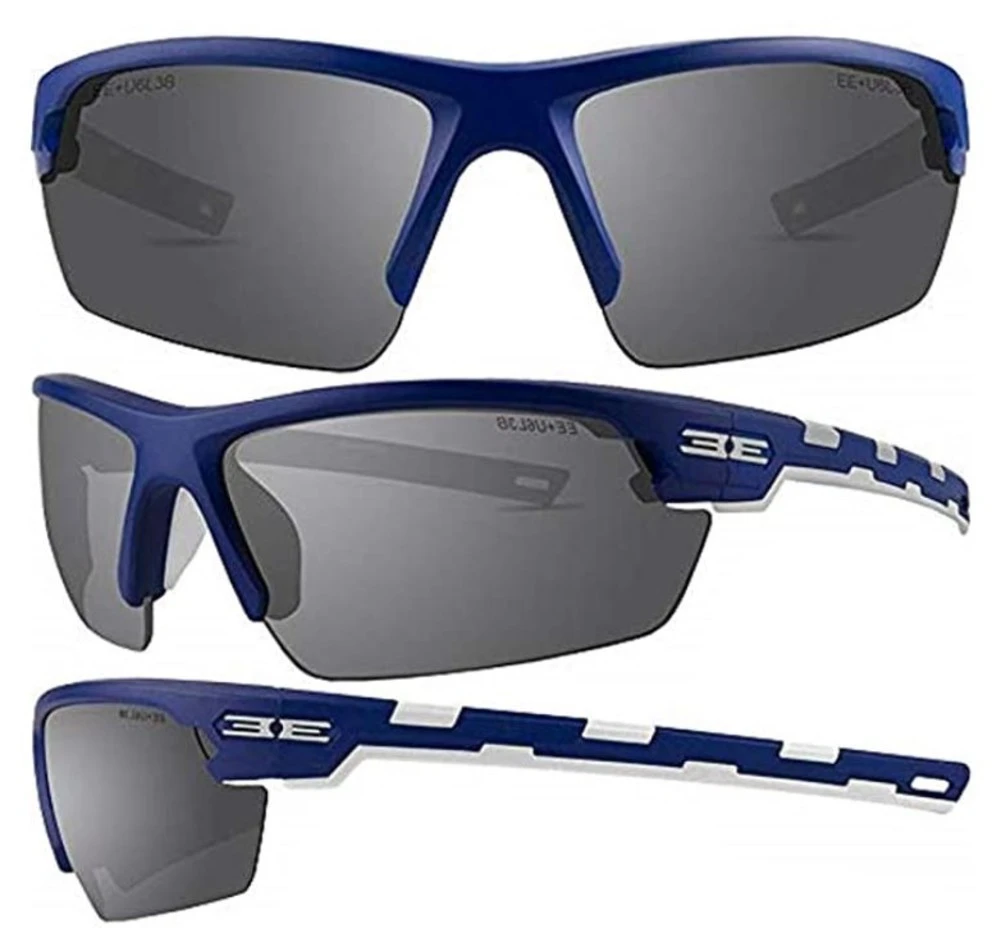 Epoch Link Sport Sunglasses, EE8241. Blue and White frames with Polarized Gray Smoke lenses. The Epoch Link is an original design from Epoch Eyewear. Shatterproof polycarbonate lenses for maximum protection. The frame includes the most overall inlayed rubber of any of our styles to ensure a perfect fit and durability. These features make this one of our favorite styles. Smoke lenses are best for maintaining the true colors of what you’re looking at. They block the most amount of light, which will help to reduce eyestrain if you’ll be outside for an extended period of time. Meets or Exceeds ANSI Z87.1 Standards. Epoch Eyewear is a Veteran owned and operated company. We are proud to be a part of the Veteran community and build a company that provides jobs and great products. EE8241
