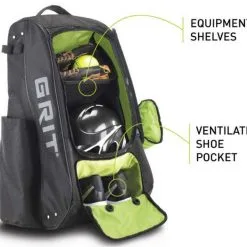 Grit Inc. Baseball/Softball 26″ Backpack Bag, Back Pack, Black BP01-026-B. New to the GRIT Baseball Series is the Ball Pack. Comfortable backpack straps help you transport your Ball Pack to and from the diamond. The Ball Pack includes some of GRIT?s signature features such as ventilation, organization, high-vis lining, a removable door for team logo application and a ventilated shoe compartment. Other great features: An Air Dry Air Flow Feature. Equipment Shelves. Adjustable backpack straps. Bat sleeves on either side, holds 2 bats per side. Removable front door panel for easy access. Insulated cooler pocket for that all important water bottle. Accessory pocket on top for easy access to cellphone. Measures: Height: 26″ Width: 14″ Depth: 13.5″ Weight: 5 lbs. Color: Black. BP01-026-B