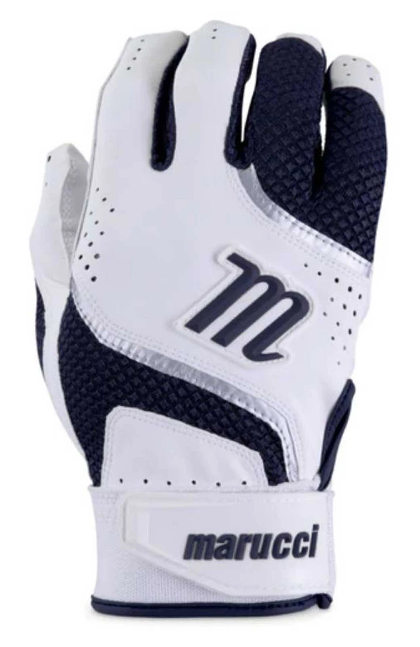Marucci Code Adult Batting Gloves – Navy Blue/White, MBGCD2-W/NB. Stitched with a thick leather palm and dimpled mesh back, the Crest batting gloves provide a flexible, breathable and long-lasting glove. Synthetic leather palm with genuine leather feel and performance. Rubberized synthetic thumb layer prevents friction in a high-wear area. Diamond stretch mesh and two-way stretch knit for superior mobility, flexibility and durability. Elastic closure for support and comfort.