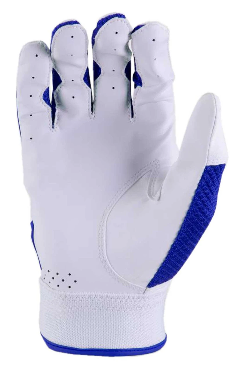 Marucci Code Adult Batting Gloves – Royal Blue/White, MBGCD2-W/RB. Stitched with a thick leather palm and dimpled mesh back, the Crest batting gloves provide a flexible, breathable and long-lasting glove. Synthetic leather palm with genuine leather feel and performance. Rubberized synthetic thumb layer prevents friction in a high-wear area. Diamond stretch mesh and two-way stretch knit for superior mobility, flexibility and durability. Elastic closure for support and comfort.