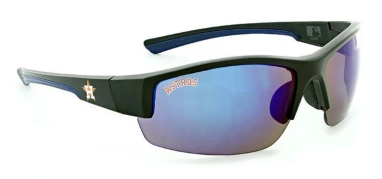 Optic Nerve Houston Astros Hot Corner Sunglasses – Black and Navy Blue Frame & Blue Mirrored Lenses, 05276. Is it hot in here or is it just you in these great sunglasses? Check out this stylish yet durable pair of sunglasses that will have everyone’s head-turning! The popular sports wrap fit and team customization makes these the ultimate baseball shades of the season. Featuring high impact polycarbonate lenses with 100% UV protection. These sunglasses also meet ANSI z80.3 standards for impact resistance. Officially licensed by MLB.