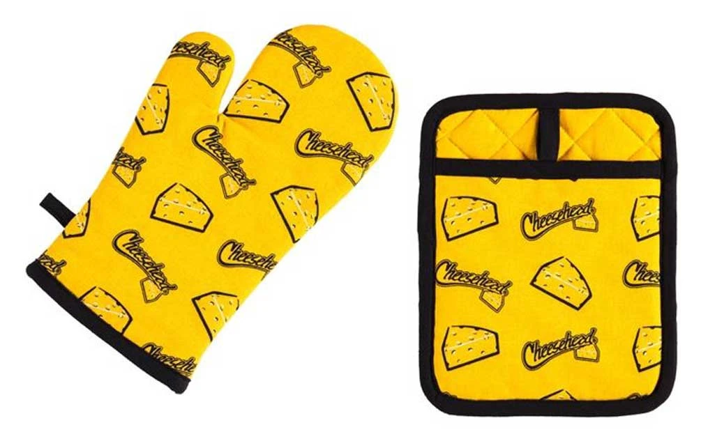Original Cheesehead? Oven Mitt & Pot Holder Set – Gold & Black, P1095070. Repeated Cheesehead pattern logo. Made from soft and high-quality 100% cotton. Oven Mitt Size: 12″ x 6″. Potholder Size: 10″ x 8″. Add flair to your kitchen this Football Season. Machine wash cold, tumble dry low. Do not bleach.