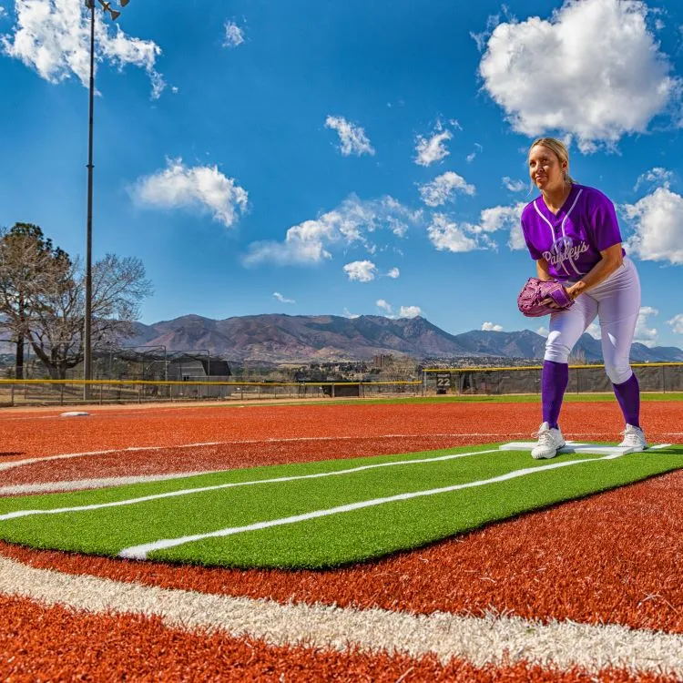 Now longer and wider! More stride length behind the rubber. Protects turf from toe drag.