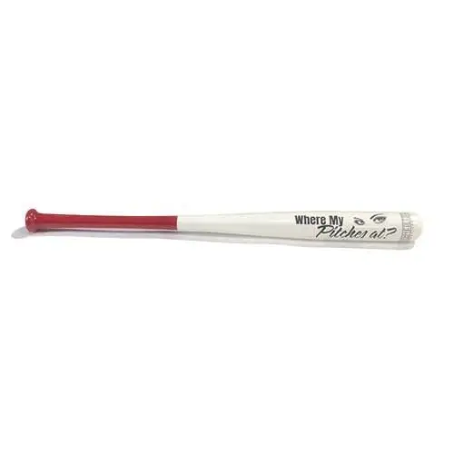 This bat sports a red handle, and white barrel engraved with the team name – “Where’s My Pitches At? Softball”, and a pair of seductive eyes, all painted black.