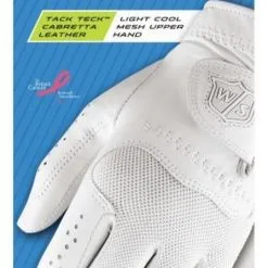 The new Wilson Staff Women’s Conform Glove hasan idealfit and feel. The premium Abyssinian cabretta leather has 3M Scotchguard protection for softness round after round. The Ultramate Velcro gives it a tighter closure and hold throughout play. performance mesh dissipates heat and moisture. This glove looks feminine and appeals to all women golfers. Color: White. WGJA00303